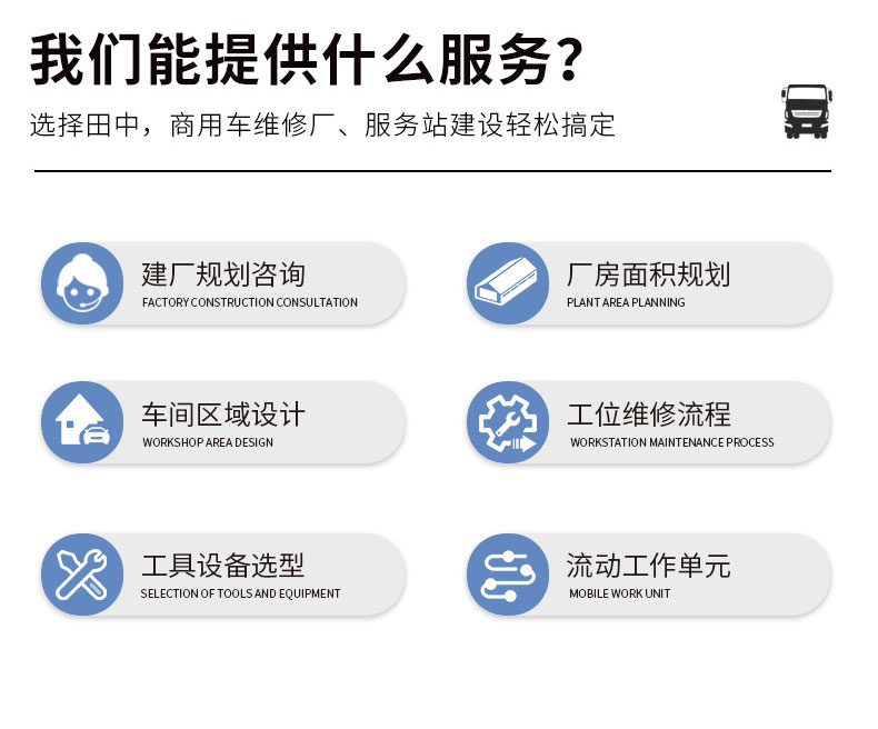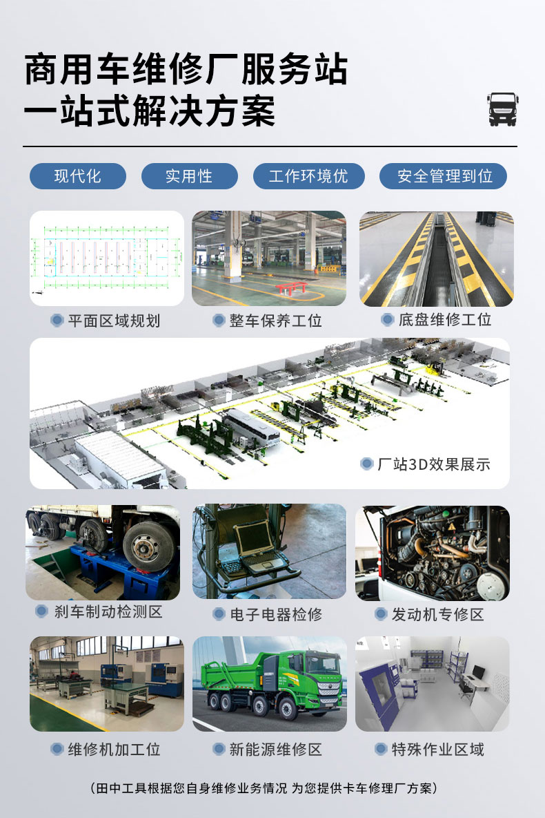 產(chǎn)品說明:商用車服務站建站方案滿足您對廠區(qū)規(guī)劃,工位布局,設(shè)備選購等一切服務!