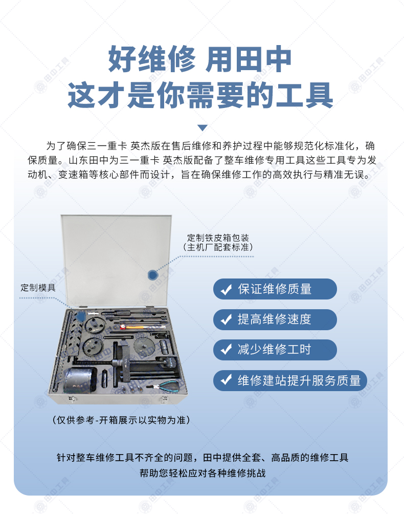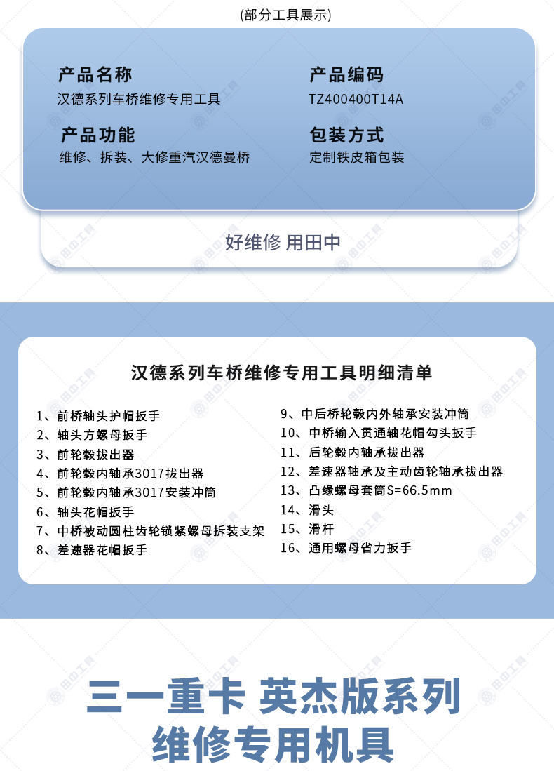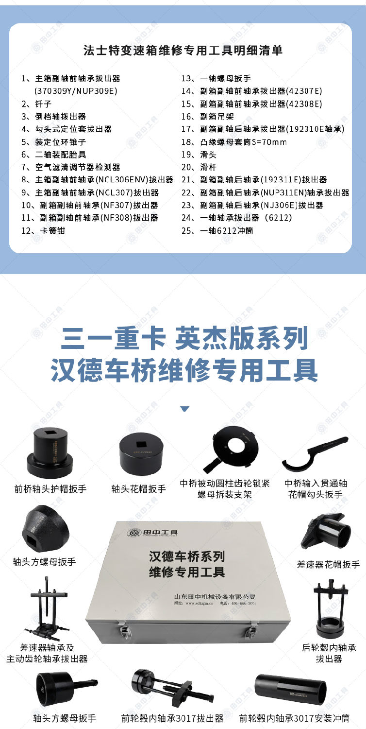 產(chǎn)品說明:三一重卡英杰版維修專用工具【HQC4250T】是針對陜汽德龍X3000系列而開發(fā)設計的一套產(chǎn)品,其操作簡單、拆裝方便,大大節(jié)約了人力、物力成本;滿足拆裝技術要求,使操作更加的規(guī)范化。