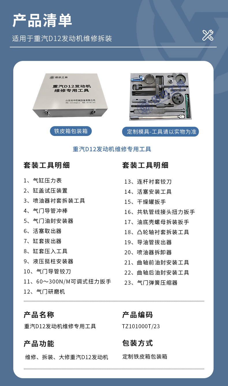 產(chǎn)品說明:山東田中機(jī)械設(shè)備有限公司,是中國(guó)重汽、陜汽、歐曼等卡車廠家指定工具配套商.本套產(chǎn)品,內(nèi)含23件D12發(fā)動(dòng)機(jī)維修工具,定制鐵皮包裝箱;設(shè)計(jì)合理,操作方便,是您快速維修發(fā)動(dòng)機(jī)的好幫手;田中,致力打造中國(guó)卡車維修工具品牌。