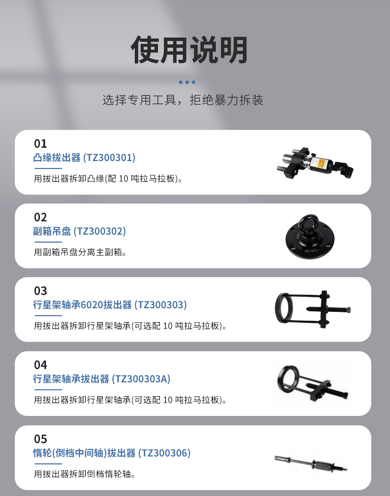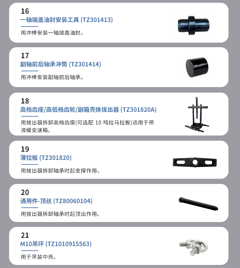 - HW13709變速箱維修專用工具【TZ301700T13】是針對HW13709變速箱而開發(fā)設(shè)計的一套產(chǎn)品,其操作簡單、拆裝方便,大大節(jié)約了人力、物力成本;滿足拆裝技術(shù)要求,使操作更加的規(guī)范化。